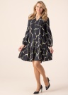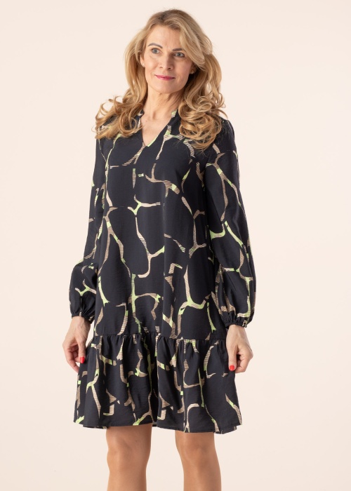 Armas ja naiselik b.young kleit Ibine lubab end hästi tunda igal pool. Kleit on õhuke ja lendlev. Mugavust lisavad kummid varrukaotstes ning seelikuosa moodustavad laienevad volangid. Silmailu lisab mänglev muster. Kogu päeva kestev liikumismugavus on garanteeritud! Modelli pikkus on 178 cm ning kannab suurust 36.