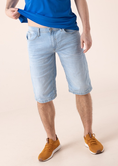 Blend põlvpüksid sobivad ideaalselt suvehooajal kandmiseks! Aasadega vöökoht kinnitub nööbi ja lukuga. Kolmest esitaskust üks on väiksem ning vasaku nurgal asetseb ümmargune brändi logo. Tagumisel küljel asetsevad kaks pealistaskut, milledest parema kohal paikneb kangast tekstiga embleem. Suvisust lisab rõivale kulutatud efekt, elastne teksas on jalas mugav. Modelli pikkus on 188 cm ja kannab suurust L.