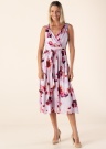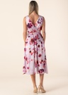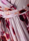 Naiselik Esprit kleit mõjub värskelt ja maitsekalt. Hõlmikkaelusega ilma varrukateta kleit on hästi langev ning midi pikkusega. Vasakul küljel paikneb lukk , keskkohas on seotav vöö ja silmailu lisab mänglev muster. Modelli pikkus on 177 cm ning kannab suurust 36.