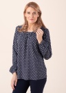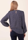 Esprit pluusi katab tihe digi südamete muster ja pisikesed täpid. Avarama sirge lõikega pluus on vabalt langev, ümar kaelus on eest kroogitud ja pikkade varrukate otstes on elastsed kummid. Turjal kinnitamiseks pisike nööp. Modelli pikkus on 178 cm ja kannab suurust S.