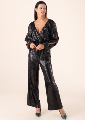 Efektse Esprit pükskostüümi pilkupüüdev välimus teeb terveks päevaks tuju heaks. Laiade säärtega ja sädelev pükskostüüm on naiselik. Pealispinnal on läikivad litrid ning praktilisust lisab nööpkinnitus. Taga on lukk. Toote võluv lihtsus võidab südameid! Modelli pikkus on 176 cm ning kannab suurust S.
