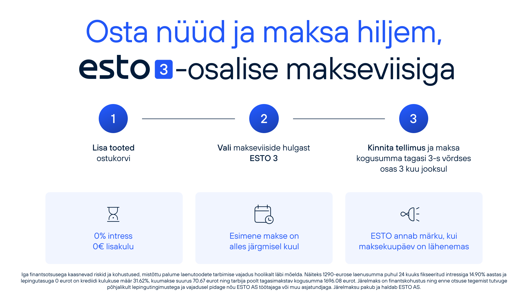 Vali toodete eest maksmiseks ESTO 3-osaline makseviis – jaga ostukorvi maksumus kuni kolmeks võrdseks osaks, ilma ühegi lisatasuta! Lisa e-poes meelepärased tooted ostukorvi, vali tarneks pakiautomaat või kuller ja makseviisiks ESTO 3. Kinnita ost mugavalt oma ID-kaardi, Mobiil-ID või Smart-ID-ga.