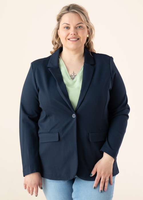 Klassikaline Fransa Plus Size jakk Stretch loob oma kauni visuaaliga piduliku meeleolu. Elegantne viisakas jakk on meeldiva puudutusega ning reväärkraega. Ees on nööpkinnitus, esiküljel klappidega taskud ja õla kohal õlapadjad. Sisepind on voodrivaba. Sobita erinevate riietega ning loo värskeid stiile! Modelli pikkus on 167 cm ning kannab suurust 46.