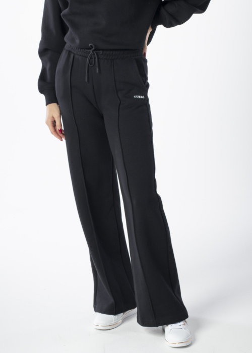 Guess naiste dressipüksid on ideaalsed igapäevaseks kandmiseks. Laiad sääred ja sisepind uhutud tagavad mugavuse ning pehmuse. Vabaaja veetmiseks sobivad püksid on varustatud brändi kirjega vasaku tasku all ja disainõmblusega ees. Kumm värvlil ja tunnelpael värvlil lisavad praktilisust. Modelli pikkus on 176 cm ja kannab suurust S.