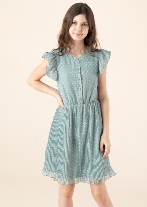 Võluv Guess kleit on vääriline valik pidulikeks puhkudeks. Armas kleit on elegantne ja plisseeritud. Lisaväärtusena on toode kerge ja kaasaliikuv. Ees on nööpkinnitus , ilmekust lisavad veetlevad satsid varrukaotstes ning sisemuses on aluskleit. Modelli pikkus on 155 cm ning kannab suurust 147.