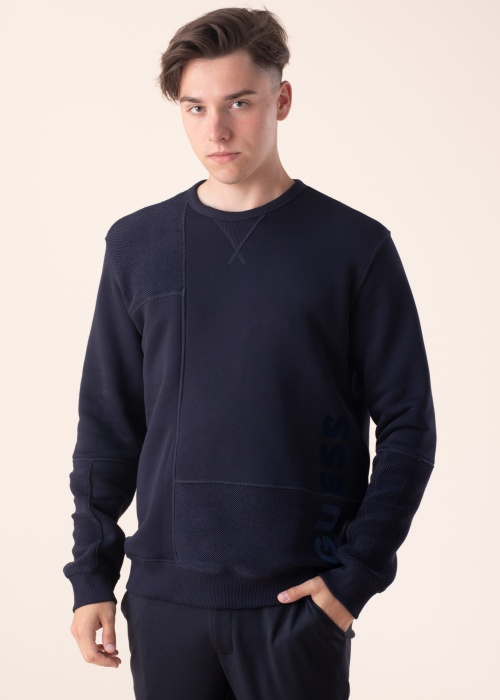 Regular Fit lõikega Guess pusa on kombineeritud siledast ja struktuursest kangast, mis lisab lihtsale disainile moodsat nüanssi. Klassikalise ümara kaelusega pusal on servades elastne soonik ning brändi sametine kirje lookleb horisontaalselt vasakul küljel. Modelli pikkus on 186 cm ja kannab suurust L.