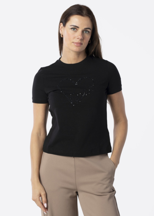 Guess naiste T-särk on lihtne ja taljesse hoidev, pakkudes mugavat ja stiilset välimust. Sellel on ümar kaelus ning ees põnev muster, mis lisab särtsu igapäevasele riietusele. Ees olevad läikivad litrid annavad särgile erilise sära. Modelli pikkus on 176 cm ja kannab suurust S.