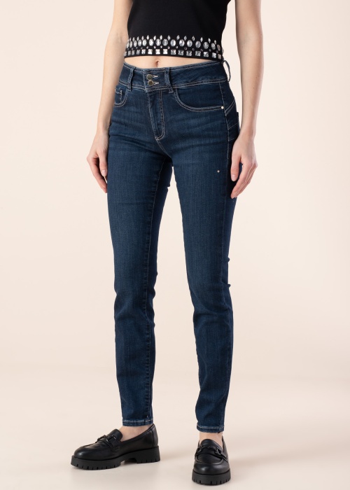 Hästi istuvad Guess teksapüksid Shape Up sobivad argiseks kandmiseks. Skinny Fit lõikega stiilsed teksapüksid on kõrge värvliga ja kitsenevate säärtega. Värvel kinnitub nööbi ja lukuga ning esi- ja tagaküljel on avatud taskud. Kandmismugavust pakub materjali elastsus ilmekust lisab brändi märgis tagataskul. Modelli pikkus on 174 cm ning kannab suurust 27-31.