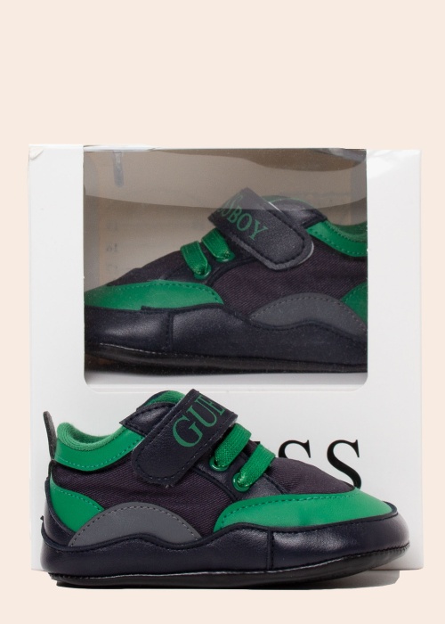 Nunnud papud Guess loomingust pisikesele beebipoisile. Pealispind on valmistatud kombineerituna tekstiilist ja pehmest kunstnahast. Lihtsasti jalga pandavad takjakinnitusega, milledel kirjutis Guess Boy. Kerge polsterdusega sisetald on tekstiilist ja välistald kunstnahast.