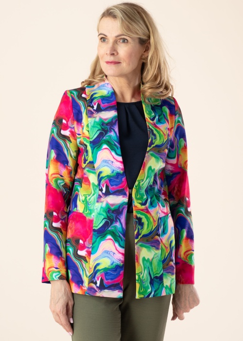 Naiselik Hansmark jakk Neeli esindab klassikat. Elegantne ja meeldiva puudutusega jakk on pikema tegumoega. Eest kinnitub magnettrukiga ja ees on avatud taskud. Õla kohal on õlapadjad ning silmailu lisab mänglev muster. Sisepind on voodrivaba. Modelli pikkus on 178 cm ning kannab suurust 38.