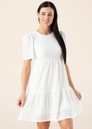 Dünaamiline JDY kleit Carla Cathinka sobib suviseks kandmiseks. See pitsiline kleit on nooruslik ja lühikeste varrukatega ning lisaväärtusena on toode pehme ja elastne. Seelikuosa moodustavad laienevad volangid ning sisemuses on aluskleit. Modelli pikkus on 176 cm ning kannab suurust S.