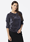 Kairi Vilderson naiste pluus on pidulik ja efektne rõivaese, mis sobib suurepäraselt erilisteks sündmusteks. Pluusil on ümar kaelus ja kolmveerand varrukad, mis on kaunistatud sädeleva kroogega kaelusel ning kummikant varrukaotstes. Materjal on läbikumav, lisades pluusile elegantset hõngu. Modelli pikkus on 176 cm ja kannab suurust 38.