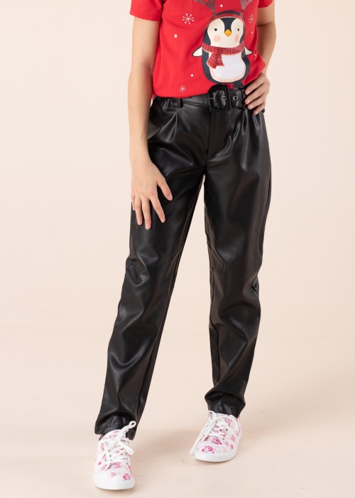 Kids Only kunstnahast püksid järgivaid hiljutisi trende ja on loodud stiiliteadlikele noortele! Pükstel on avar lõige ning keskmise kõrgusega vöökoht, kus on vööaasadega kummiga elastne värvel ning luku, haagi ja nööbiga esikinnis. Külgedel on mugavad diagonaalsed taskud ning ees on lisaavarust andvad väikesed voldid. Kaasa tuleb ka kunstnahast rihm, millel on suur sama materjaliga kaetud pannal. Modelli pikkus on 147 cm ja kannab suurust 146.