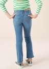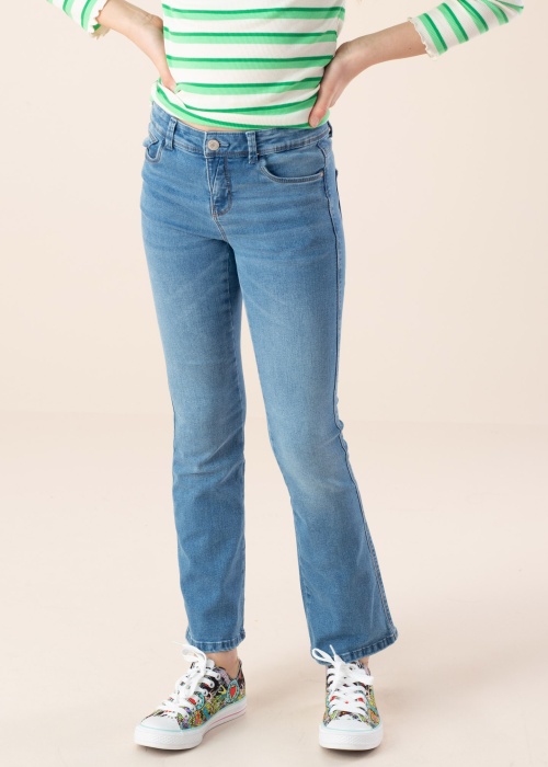 Nooruslikud ja moodsad Name It Kids teksapüksid Polly muudavad iga koolipäeva stiilselt mugavaks. Alt laienevate säärtega teksapüksid on Skinny Fit lõikega ning keskmise kõrgusega värvliga. Värvel kinnitub haagi ja lukuga ning ümbermõõtu võimaldab reguleerida siseküljel paiknev nööpavadega tunnelkumm. Esi- ja tagaküljel on avatud taskud ja kandmismugavust pakub materjali elastsus. Toode on värvitud indigo värvainega. See annab originaalse teksavärvi, mis tuhmub pesemise ajal loomulikul moel. Modelli pikkus on 154 cm ning kannab suurust 152.