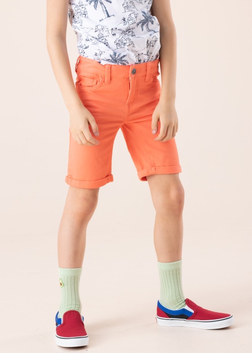 Slim lõikega Name It lühikesed püksid Sofus on mitmekülgne rõivaese, mida kanda suvel nii igapäevaselt kui ka mõnel tähtsamal sündmusel. Püksid kinnituvad jalga metalse haagiga ja tõmblukuga, esi- ja tagaküljel kaks avatud tegumoega taskut. Parema istuvuse loomiseks on vöökohta võimalik reguleerida sisemuses oleva tunnelkummiga ning tagasipööratud sääred loovad rõivale omase kuju ja viisaka väljanägemise. Puuvillane kangas on tõeliselt mugav ja nahasõbralik! Modelli pikkus on 130 cm ja kannab suurust 122.