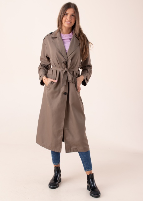 Ajatu tegumoega Only mantel Line on õhuke ja kerge. Sellel on klassikaline revvärkrae, ees nööpkinnitus, külgedel avatud taskud ja keskkohas seotav vöö. Aktsenti lisavad mansetid varrukaotstes ja pagunid õlgadel. Sisemus on voodrivaba ja tagaküljel on mugav lõhik. Modelli pikkus on 178 cm ja kannab suurust S. Üldpikkus antud suurusel on 121,5 cm.