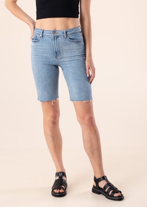Rebitud säärtega Only lühikesed teksapüksid Emily on pikema bermuuga pikkusega ja mitte venivast teksakangast. 5 taskuga mudeli värvel on klassikalise nööbi ja luku kinnitusega. Modelli pikkus on 177 cm ja kannab suurust 27.