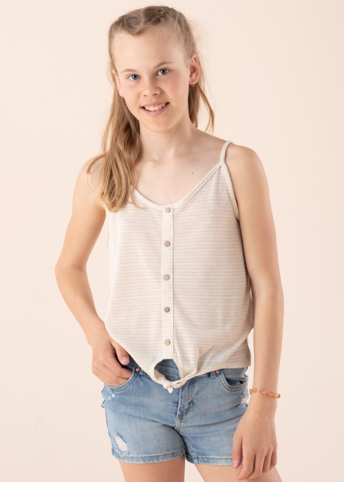 Vahvalt triibuline Only topp Cannes on peenikeste õlapaeltega mõnusalt suvine. Efekti lisab sädelus, ees on dekoratiivsed nööbid ja alumine serv on keskelt sõlme seotud. Modelli pikkus on 146 cm ja kannab suurust 146/152.