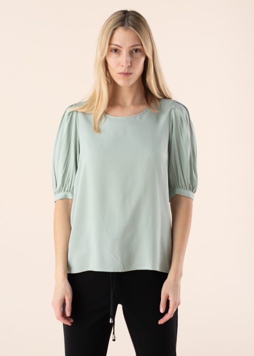 Only pluus Karma on loodud mugavust ja kvaliteeti hindavale naisele. Hinnatud viskoosmaterjalist pluus on pehme puudutuse ja meeldiva langevusega, mille rõhuasetuseks paikneb stiilsetel puhvvarrukatel. Modelli pikkus on 177 cm ja kannab suurust S.