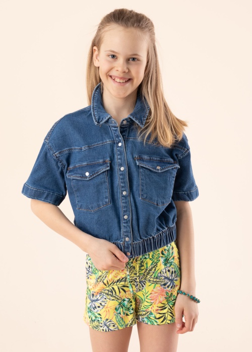 Midagi teistsugust ja erilisemat pakub Only teksapluus Sophie, olles klassikalise reväärkraega, ent lühema kehalõikega, kus all servas on mugava laiusega kumm ning esiküljel trukk-kinnitus. Kaks rinnataskut on stiilsete klappidega ja varrukad avara lõikega. Modelli pikkus on 146 cm ja kannab suurust 146.