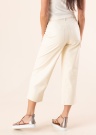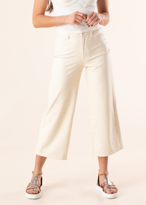Nahkimitatsiooniga omapärased naiste 7/8 pikkusega püksid, brändilt Only, loovad silmapaistva mulje. Püksid on kõrge pihaga ning laialõikeliste säärtega, eest suletavad luku ja nööbiga. Vööd ümbritsevad aasad, mis lubavad pükse kaunistada rihmaga. Külgedel paiknevad imitatsioontaskud ning tagaküljel avatud taskud. Pükste hea venivus ning pehme sisevooder tagavad kandes mugavuse. Modelli pikkus on 176 cm ning kannab suurust S. Materjal: polüester 95%, elastaan 5%. Värv: valge.
