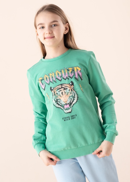 Motiveerivate kirjadega orgaanilisest puuvillast Only pusa Lucinda on mõnus igapäevane kaaslane! Keskmise paksusega dressikangast pusal on pikad veidi mahulised varrukad ja väike ümar kaelus, allääres ja varrukaotstes on lai kant, mis hoiab kenasti keha vastu. Esiküljel on suur leopardi pilt, mis on ümbritsetud kirjadega. Modelli pikkus on 147 cm ja kannab suurust 146.