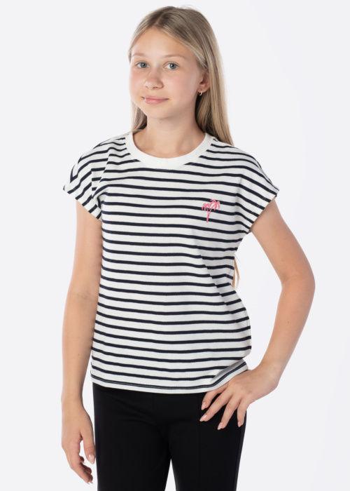 Only tüdrukute t-särk Trine on ideaalne valik suviseks hooajaks. Sellel on triibuline muster ja rinnal kaunis tikand, mis lisab särgile unikaalsust. Mugav lõige tagab, et teie laps tunneb end selles t-särgis alati hästi.