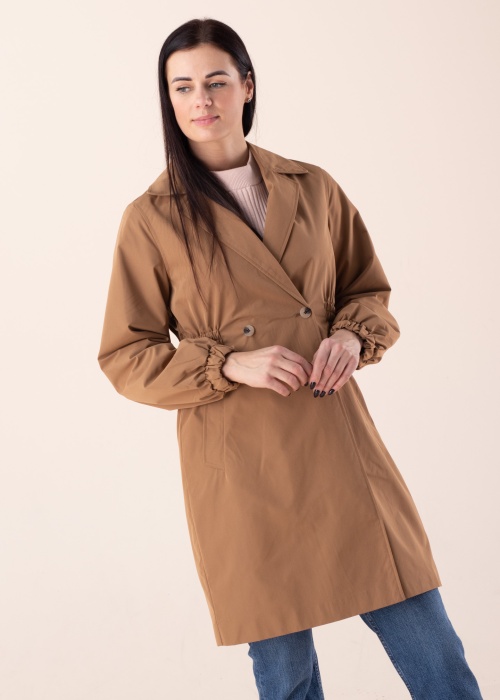 Armas ja trendikas Pieces kevad-sügismantel kaunistab igat naist ning tema riietust! Mantlit ilmestab sümpaatne reväärkrae ning kaherealine nööpkinnitus. Elastne taljeosa, mis lookleb mõlemal küljel annab mantlile naiseliku silueti. Ülerõiva esiosa ilmestavad kaks esitaskut ning täispikkade varrukate otstes lookleb elastne kumm, mis annab neile kergelt puhvvarrukate olemuse. Polüestrist pehme sisevooder on seljas mugav ning seljaosa tagumisel äärel on õrn lõhik, mis muudab liikumise mugavaks ja lihtsaks. Modelli pikkus on 176 cm ja kannab suurust S. Üldpikkus turjast alumise ääreni on 93 cm.