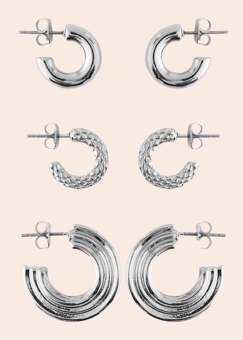 Imekenad, üdini naiselik kõrvarõngaste komplekt brändilt Pieces koosneb kolmest paarist, mis kõik kannavad erinevat stiili – sileda pealispinnaga, paksemad rõngad, reljeefse pealispinnaga väiksemad hoop stiilis kõrvarõngad ning omanäolise, mitmekordse ilme loovad, laiemamoelised kõrvarõngad. Kõrvarõngaste pikkused pildil esitatud järjekorras on : 1,3 cm, 1,2 cm ja 2,5 cm.