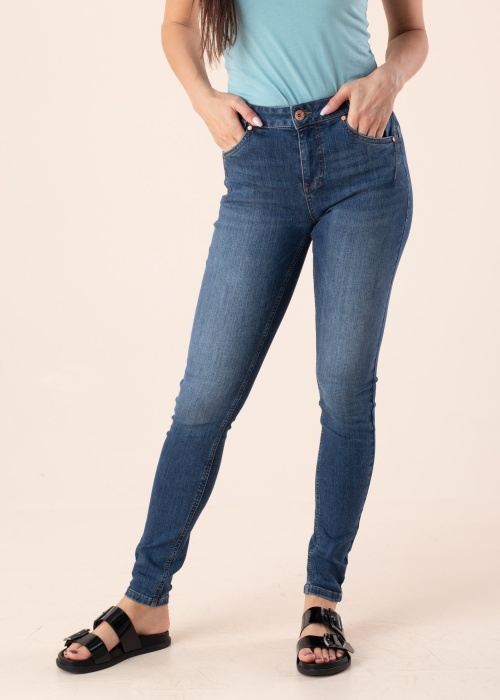 Pulz teksad Emma on ajatu kitsa skinny lõikega ning mugava kõrge vöökohaga. Värvlil on aasad vöö jaoks ning esikinnis on luku ja nööbiga. Esiküljel kaks ümarat taskut- vasakpoolse tasku kohal on lisaks väike imitatsioontasku ning tagaküljel on kaks terava nurgaga pealeõmmeldud taskut, mida kaunistavad needid. Vööaasa küljes ripub väike metallist brändi logoga rõngas, mille saab soovikorral eemaldada. Teksad on õrna kulutatud kivipesu ilmega. Modelli pikkus on 176 cm ja kannab suurust 27/32.