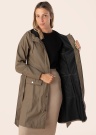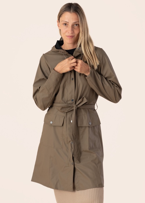 Rains naiste vihmamantel Curve Long on praktiline ja ühevärviline rõivaese, mis sobib suurepäraselt kevad- ja sügishooajal kandmiseks. Mantlil on kapuuts ning see on valmistatud vetthülgavast materjalist, mis tagab kaitse vihma eest. Naiselik A-lõikeline disain ja seotav vöö keskkohas loovad elegantse silueti. Ees on trukkidega kinnis ning esiküljel asuvad klapiga taskud, mis lisavad lisafunktsionaalsust. Modelli pikkus on 177 cm ja kannab suurust S.