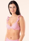 Бюстгальтер бикини Esprit придаёт чувство уверенности. Бюстгальтер бикини- средняя поддержка, безопасный для кожи и узор в клетку. Выразительности добавляет привлекательный волан на плече , также удобства добавляют поддерживающие дуги. Длина брителей регулируется. Рост модели - 176 см и носит размер 36B.