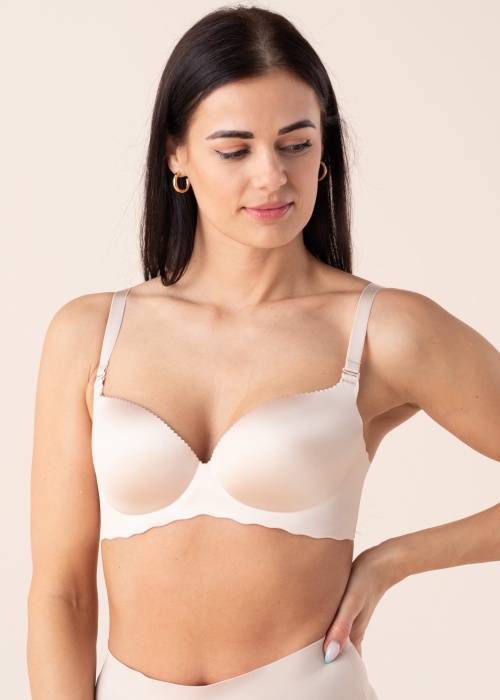Бюстгальтер эффектного цвета Lauma позволяет чувствовать себя красивой и комфортно. Бесшовный бюстгальтер с чашечками без уплотнителя. Ткань с красивым блеском комфортно облегает тело. Регулируемые бретели средней ширины. На спинке широкая трёхрядная застёжка на крючки. Идеален под футболку. Рост модели 176 см. Демонстрируемое изделие размер 75B. Состав материала: полиамид 82%, эластан 18%. Цвет: бежевый