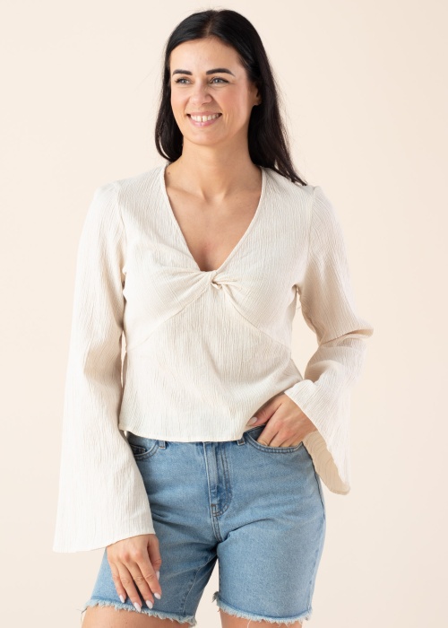 Красивая блуза Somethingnew подходит для стильной женщины. Своеобразная блуза- v-горловина и длинные рукава. Привлекательности добавляет декоративный элемент на груди , акцента добавляет рельефный узор , также на спине- резинка. Рост модели - 176 см и носит размер S.