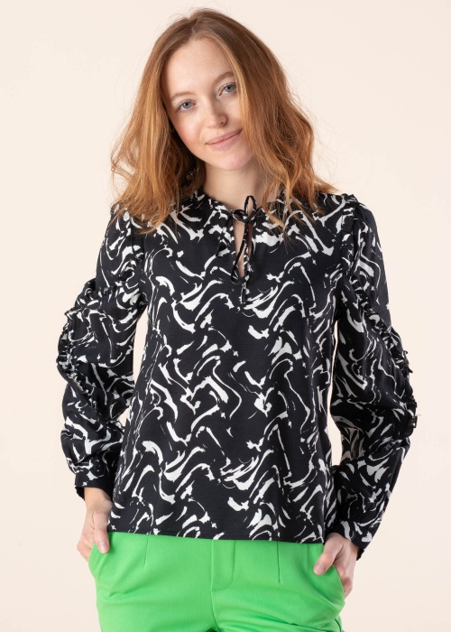 Игривая блуза Vero Moda подходит для стильной женщины. Пёстрая блуза- с круглой горловиной и прямой дизайн. На горловине имеет завязываемый шнурок , выразительности добавляют привлекательный волан , также на концах рукавов- застёжка на пуговицы. Рост модели - 174 см и носит размер S.