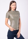 Иконическая блуза Guess - популярный и молодёжный. Классная и короткие рукава блуза- блестящая и обтягивающий покрой. Перед украшает надпись бренда и блестящие стразы. Рост модели - 177 см и носит размер S.