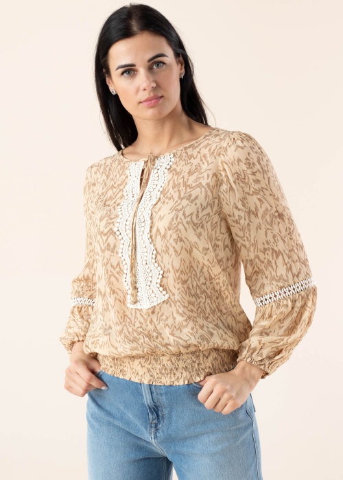 В винтажном стиле блуза EsQualo сделает каждый день особенным. Скромная и блуза- воздушный и лёгкая. Акцента добавляет кружево , на горловине завязываемый шнурок и как на краях рукавов, так и снизу резинка. Игривый узор добавляет привлекательности. Рост модели - 176 см и носит размер 36.