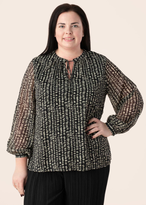 Эта стильная женская блузка от Vila Evoked привлекает внимание своим интересным узором и легкой, полупрозрачной тканью. Она воздушная и струящаяся, с завязкой на воротнике и пуговицами на манжетах. Модель ростом 167 см носит размер 46.