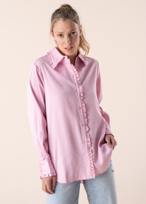 Стильная, эффектная и невероятно женственная блуза Selected Femme Nallie идеальна для повседневного гардероба, а также для более торжественных мероприятий. Отложной ворот, застёжка на пуговицы на полочках и манжеты на рукавах обрамляет эффектная оборка. По бокам изделия расположены разрезы. Лёгкая, летящая ткань. Рост модели 177 см. Демонстрируемое изделие размер 36. Состав материала: вискоза 54%, полиэстер 33%, нейлон 13%. Цвет: розовый