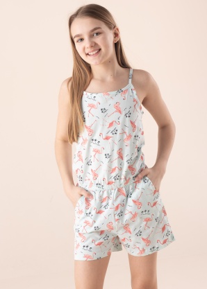 Брючный костюм с лямками Name It Vigga станет летним хитом, благодаря своей лёгкости и комфорту. Лёгкость изделия обеспечивает чувство свежести продолжительное время. Костюм с графическим принтом фламинго. На талии резиновая стяжка, придающая красивую и комфортную посадку. По бокам изделия расположены открытые карманы. Рост модели 147 см. Демонстрируемое изделие размер 146. Состав материала: хлопок 100%. Цвет: голубой/цветной/узорчатый