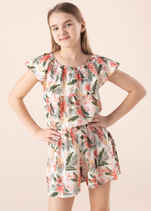 В этом брючном костюме Vinaya от Name It Вы встретите теплое лето! Прелестный тропический узор одежды сразу создает ощущение, что пора наслаждаться отпуском и безграничной свободой летнего сезона! Легкий тканевый костюм украшен вырезом-лодочка с извилистой оборкой, на талии находится резинка, которая украшена симпатичным галстуком. Легкая и воздушная ткань удобна и приятна в ношении. Рост модели 147 см, изделие в размере 146.