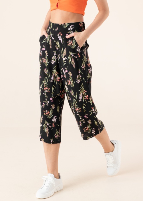 Брюки Vero Moda подходят для наслаждения летними днями. Эти узор в цветок летящий брюки - высокая талия и широкие штанины. Сбоку открытый карман и сзади имеет резинка. Рост модели - 177 см и носит размер S.