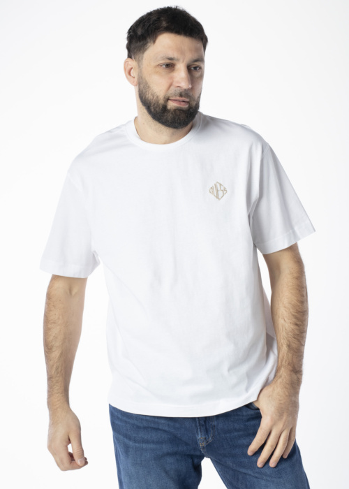 Футболка Guess Diamante - это стильная и универсальная вещь для вашего гардероба. Она имеет круглый вырез, классический дизайн и логотип бренда на груди. Модель имеет рост 188 см и носит размер L.