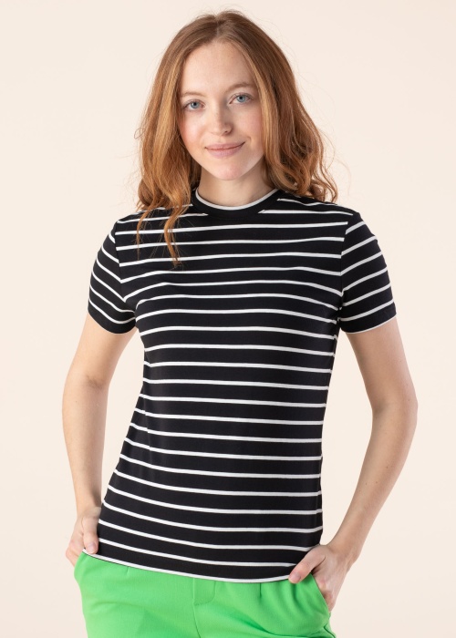 Классная футболка Esprit подходит для повседневного ношения. Приятно мягкая полосатый узор футболка - с круглой горловиной и полуобтягивающий покрой. Удобства добавляет эластичность материала. Рост модели - 174 см и носит размер S.