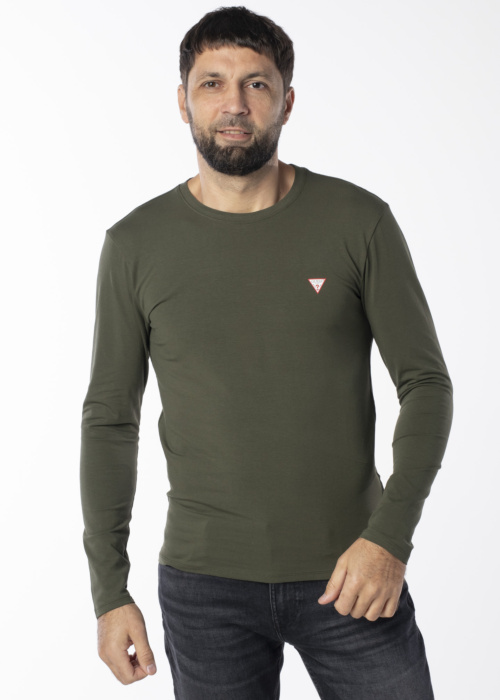 Футболка для мужчин от Guess отличается практичностью и комфортом. Она имеет длинные рукава и круглый вырез. Логотип бренда Guess расположен на груди.