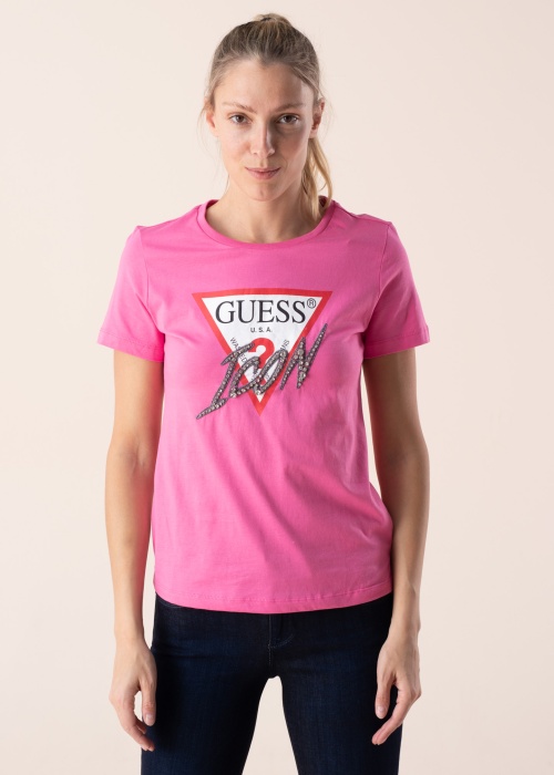 Красивая футболка с короткими рукавами Guess идеальна для повседневного гардероба. Передняя часть изделия с эффектным логотипом бренда, украшенным надписью Icon, выложенной сверкающими камушками. Рост модели 177 см. Демонстрируемое изделие размер S. Состав материала: хлопок 100%. Цвет: розовый
