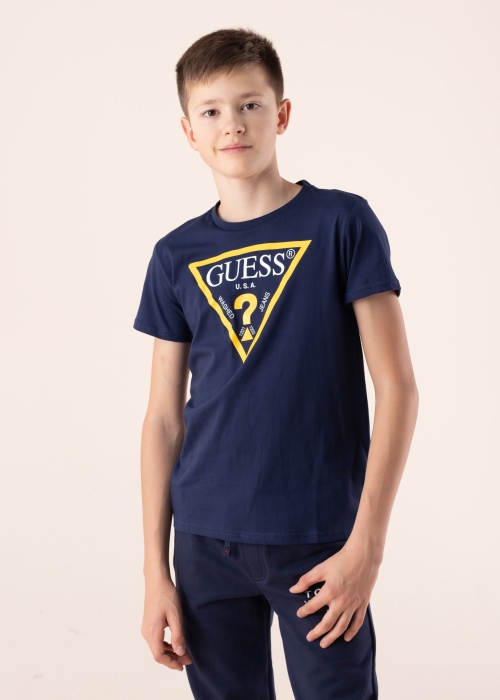 Простая футболка классического кроя для мальчиков Guess идеально подходит для повседневной носки. На сундуке есть впечатляющий логотип бренда яркого желтого оттенка. Ткань имеет хорошую эластичность, что делает платье комфортным в носке. Идеальный выбор для ношения с леггинсами или джинсами как на работе, так и на отдыхе. Рост модели - 158 см, размер - 152. Материал: органический хлопок 100%. Цвет: тёмно-синий.