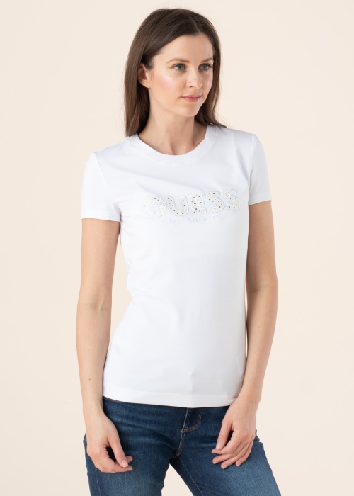Стильная футболка Guess заботится о том, чтобы мог чувствовать себя хорошо весь длинный день. Иконическая и с круглой горловиной футболка- приятно мягкая и полуобтягивающий покрой. Перед украшает надпись бренда и блестящие стразы , также приятная на ощупь ткань позволяет насладиться ношением. Рост модели - 177 см и носит размер S.