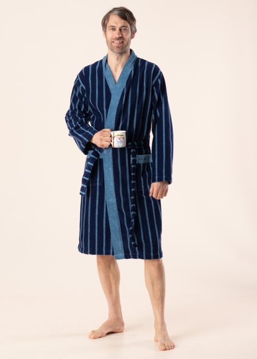 Банный халат Bugatti - это качественный бренд, созданный для мужчин, ориентированный на мужчин, - однотонный мужской халат с полосатым узором. Периодически регулируемые крышки привязаны к поясу по центру, а на внешней поверхности горизонтально расположены два открытых кармана, верхний левый край которых проиллюстрирован надписью бренда. Красивый предмет одежды в домашнем гардеробе, который можно с комфортом носить в разное время дня. Рост модели 195 см, надет размер S. Общая длина изделия - 118 см. Материал: хлопок 100%. Цвет: темно-синий / синий.