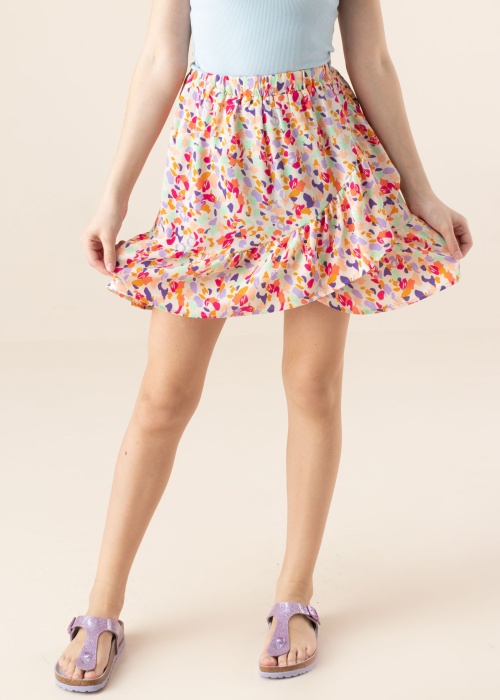 Яркокрасочная и летняя юбка Name It Kids сделает каждый день особенным. Покрой с запахом юбка- эластичная талия, лёгкая и летящая , также привлекательности добавляет привлекательный волан снизу. Рост модели - 147 см и носит размер 152.